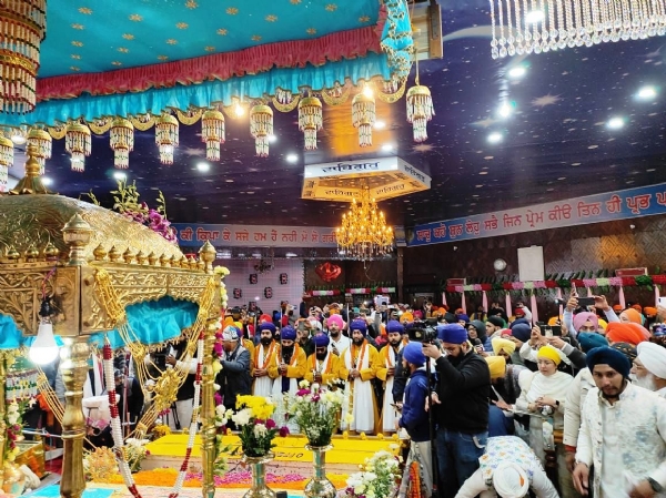 बोले सो निहाल के जयकारों और सेना की बैंड धुन के बीच ठीक साढ़े नौ बजे पंच प्यारों की अगुवाई में ग्रंथीगण भाई कुलवंत सिंह और भाई मिलाप सिंह ने सतखण्ड से पवित्र गुरुग्रंथ साहिब को दरबार हॉल में सुशोभित किया और ठीक दस बजे से सुखमणि साहिब का पाठ आरंभ हुआ।