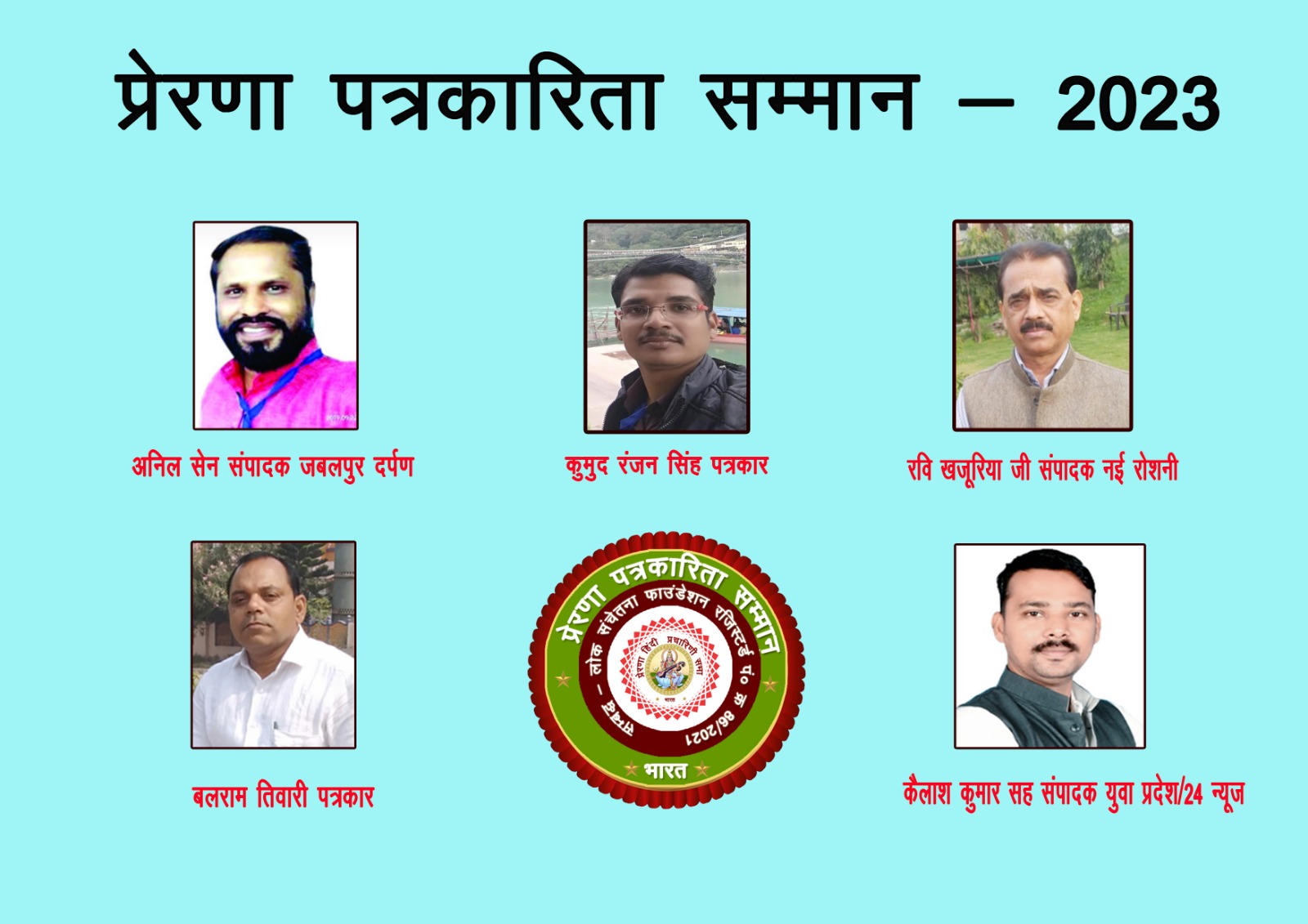 प्रेरणा हिंदी प्रचारिणी सभा के संस्थापक कवि संगम त्रिपाठी ने दिनांक 26.03.2023 को जारी विज्ञप्ति में बताया कि प्रेरणा पत्रकारिता सम्मान 2023 सर्व श्री अनिल सेन संपादक जबलपुर दर्पण जबलपुर मध्यप्रदेश, रवि खजूरिया संपादक नई रोशनी जम्मू, कुमुद रंजन सिंह पत्रकार नालंदा बिहार, बलराम तिवारी अध्यक्ष भारतीय राष्ट्रीय पत्रकार संघ अयोध्या, कैलाश कुमार सह संपादक युवा प्रदेश/24 न्यूज शहडोल मध्यप्रदेश को उनके द्वारा श्रेष्ठ पत्रकारिता सेवा हेतु प्रदान किया जा रहा है। जिसका मुख्य उद्देश्य निष्पक्ष पत्रकारिता कार्य व पत्रकारिता के माध्यम से साहित्य व हिंदी के प्रचार प्रसार को प्रोत्साहित करना है।
