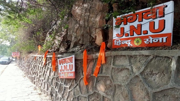 जवाहरलाल नेहरू विश्वविद्यालय(जेएनयू) में रामनवमी के दिन नॉनवेज खाने को लेकर हुए बवाल के बाद छात्रों के दो गुटों में हुई हिंसक झड़प का मामला अभी शांत नहीं हुआ था कि शुक्रवार सुबह एक और मामला सामने आया है। शुक्रवार सुबह जेएनयू के मेन गेट पर हिंदू सेना नाम के संगठन ने भगवा झंडा लगा दिया है। यही नहीं जेएनयू कैंपस के आसपास और उसकी दीवारों ने इस संगठन ने भगवा जेएनयू नाम के पोस्टर भी लगा दिए हैं। शुक्रवार सुबह यह मामला प्रकाश में आया।