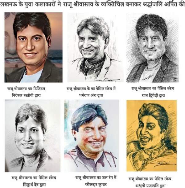 लखनऊ। चित्रकारों ने हास्य कलाकार राजू श्रीवास्तव के चित्र को बनाकर अपनी श्रद्धाजलि दी। सप्रेम संस्थान से जुड़े चित्रकारों ने अपने माध्यम से उनके चित्र बनाए। चित्रकारों में निरंकार रस्तोगी, धर्मराज अंश ,अश्वनी प्रजापति ,सिद्धार्थ देव ,फौजदार कुमार और राज द्विवेदी ने अपने अपने माध्यम में स्केच बनाये। यह सभी स्केच चित्रकारों ने अपने -अपने स्टूडियों में बनाया। युवा चित्रकार भूपेंद्र अस्थाना ने बताया कि जहाँ आज के समय में लोगों के जीवन से सभी रसों कि एक प्रकार से समाप्ति सी हो गयी है वहीँ हास्य रस के कमी को पूरा करने वाले अपने अंदाज़ में माहिर कलाकार राजू श्रीवास्तव को लोग सदैव याद करते रहेंगे। जानकारी हो कि हास्य कलाकार राजू श्रीवास्तव का 21 सितम्बर को निधन हो गया। सबको हंसाने वाले राजू को उनके प्रशंसक अपने तरीकों से याद कर रहे है। राजू का लखनऊ से भी गहरा नाता रहा है।