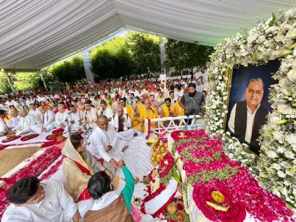 समाजवादी पार्टी के संस्थापक मुलायम सिंह यादव के लिए आज उनके पैतृक गांव सैफई में उनके आवास पर शांति यज्ञ का आयोजन किया गया। पूर्व मुख्यमंत्री अखिलेश यादव समेत परिवार के सभी लोगों ने आहुतियां देकर नेताजी की आत्मा की शांति के लिए प्रार्थना की। मथुरा, अयोध्या और हरिद्वार से आए पंडितों के द्वारा मंत्रोच्चारण के बाद हवन-पूजन की शुरुआत कर दी गई है। शांति हवन में अखिलेश यादव, डिम्पल यादव, शिवपाल यादव समेत नेताजी मुलायम सिंह यादव परिवार के सभी सदस्य मौजूद हैं।