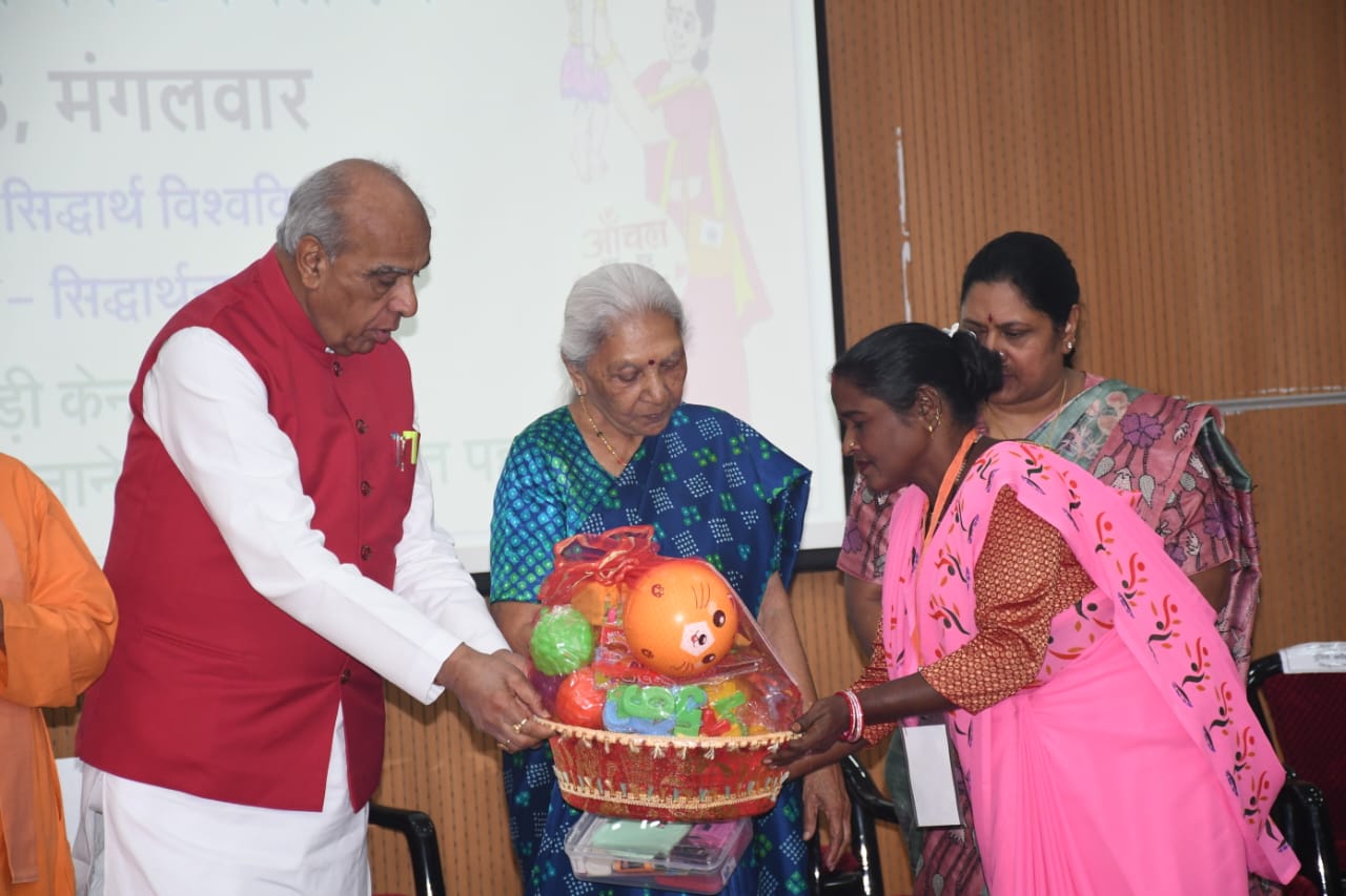 आंगनबाड़ी केन्द्रों को सक्षम एवं संशाधन सम्पन्न बनाने की एक सश्क्त पहल के अन्तर्गत राज्यपाल उ0प्र0 श्रीमती आनंदी बेन पटेल द्वारा गौतम बुद्ध प्रेक्षागृह, सिद्धार्थ विश्वविद्यालय कपिलवस्तु में आंगनबाड़ी संशाधन किट वितरण किया गया। इस अवसर पर सांसद डुमरियागंज जगदम्बिका पाल, विधायक कपिलवस्तु श्यामधनी राही, विधायक शोहरतगढ़ विनय वर्मा, कुलपति सिद्धार्थ विश्वविद्यालय कपिलवस्तु प्रो0 कविता शाह, जिलाधिकारी शिवशरणप्पा जीएन, पुलिस अधीक्षक डा0 अभिषेक महाजन, मुख्य विकास अधिकारी सिद्धार्थनगर बलराम सिंह, मुख्य विकास अधिकारी सन्तकबीर नगर जयकेश त्रिपाठी उपस्थित थे।