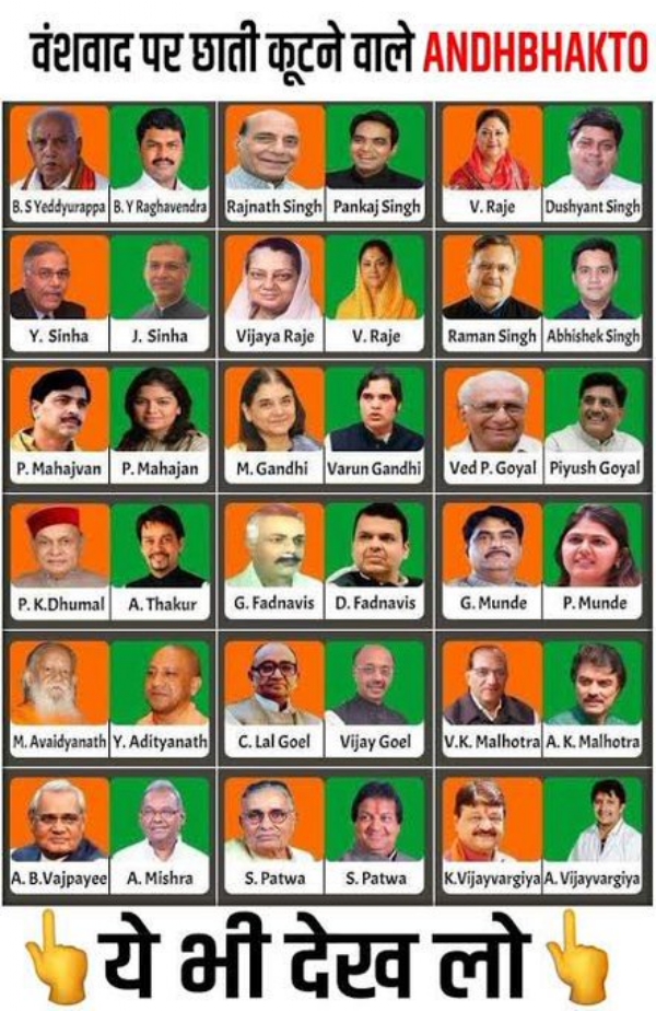 अखिलेश यादव ने मंगलवार को ट्वीट कर रक्षा मंत्री राजनाथ सिंह के बेटे पंकज सिंह, कर्नाटक के पूर्व मुख्यमंत्री और बीजेपी नेता बीएस येदियुरप्पा व उनके बेटे बी वाई राघवेंद्र, राजस्थान के पूर्व मुख्यमंत्री वसुंधरा राजे सिंधिया व उनके बेटे दुष्यंत सिंह, मेनका गांधी व उनके बेटे वरुण गांधी, विजय राजे सिंधिया व वसुंधरा राजे सिंधिया, छत्तीसगढ़ के पूर्व मुख्यमंत्री रमन सिंह व उनके बेटे अभिषेक सिंह समेत अन्य नेताओं की फोटो साझा कर भाजपा को घेरा है।
